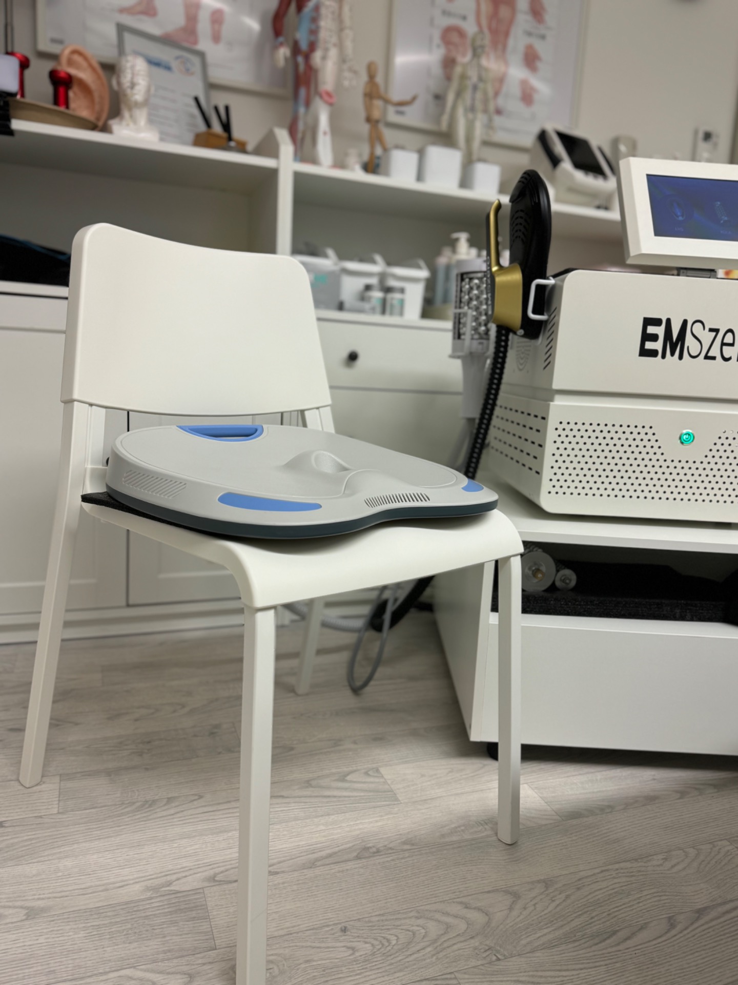 Speciální inkontinenční podložka využívá cílené elektromagnetické pulzy k jemné stimulaci svalů pánevního dna. Ošetření je neinvazivní, bezbolestné a probíhá v oblečení – klientka si jednoduše sedne na podložku a přístroj pracuje za ni.